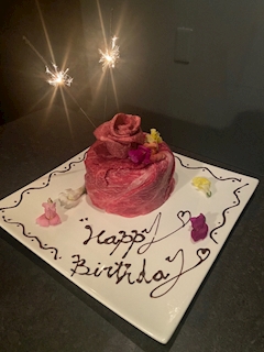 この前友達にお誕生日のお祝いしてもらいましたー!!(誕生日6月🤣🤣🤣) 大好きなお肉のケーキ😋😋 あと祝いすぎるけどおいしかったし嬉しかった🥰✨ 今日も出勤してます🫶 今週もお願いします🤲🏻