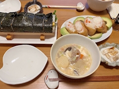 昨日の夕ご飯 母がのりまきとおいなりさん作ってくれました 美味しかったです😊 運動会を思い出しました🏃♀️ けんちん汁も具がたくさんで美味しかった~(*˘˘*)