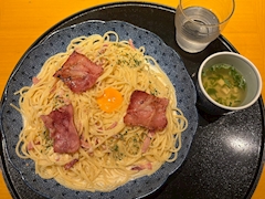 やっほーーーー!!! 今日はお休みだったので、 友達とランチ行ってきました〜🫶 洋麺屋五右衛門っていうパスタ屋さんに初めて行ったんですけど 初見の私、席ついた瞬間びっくり。 👀「……お箸??え???」ってなったの。笑 友達にここは箸で食べるんだよって言われて めっちゃいじられました😇笑 初めてパスタお箸で食べた!!笑 みんな知ってました??!笑 頼んだのはカルボナーラ🥓💓 めっちゃクリーミーで濃厚でしあわせだった🤤💫 またセットのスープが美味しすぎた〜〜 2連休の1日目から充実でした✌🏻